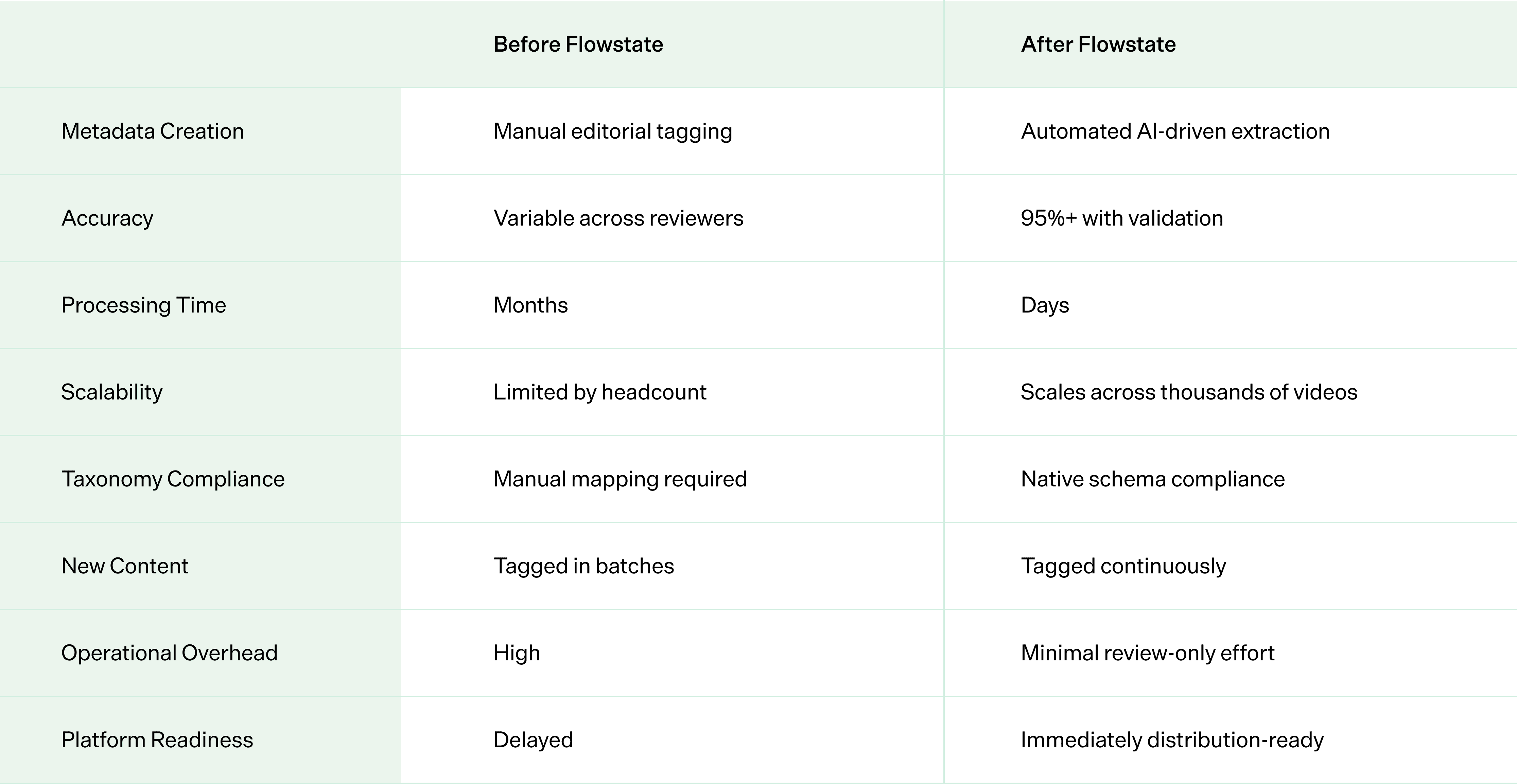 “Flowstate allowed us to move from a manual, time-consuming tagging process to an automated system we could trust. We were able to meet Samsung’s metadata requirements at scale while dramatically reducing turnaround time—and without increasing operational overhead.”
